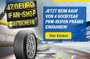 Unseren Kunden bieten wir Reifen mit hervorragenden Testergebnissen, zum Beispiel beim Bremsen auf nasser und trockener Fahrbahn, bei der Bodenhaftung in Kurven oder beim Aquaplaning. Also "Schmankerl" on top gibt es beim Kauf von 4 PKW-Reifen von Goodyear einen 20€ Fanshop-Gutschein als Dankeschön oben drauf!