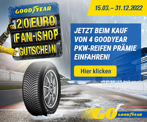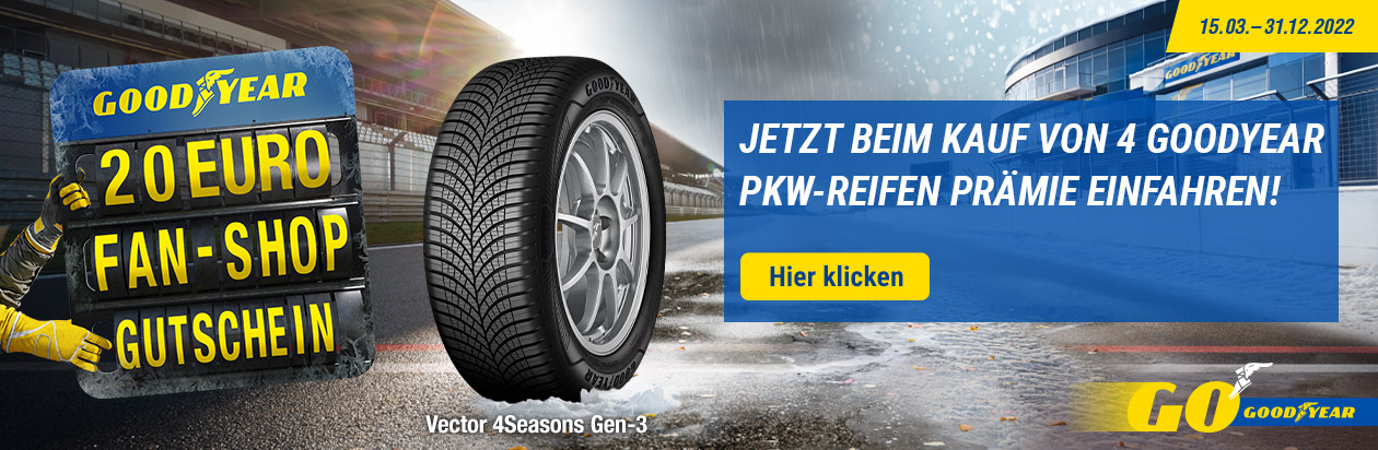 Unseren Kunden bieten wir Reifen mit hervorragenden Testergebnissen, zum Beispiel beim Bremsen auf nasser und trockener Fahrbahn, bei der Bodenhaftung in Kurven oder beim Aquaplaning. Also "Schmankerl" on top gibt es beim Kauf von 4 PKW-Reifen von Goodyear einen 20€ Fanshop-Gutschein als Dankeschön oben drauf!